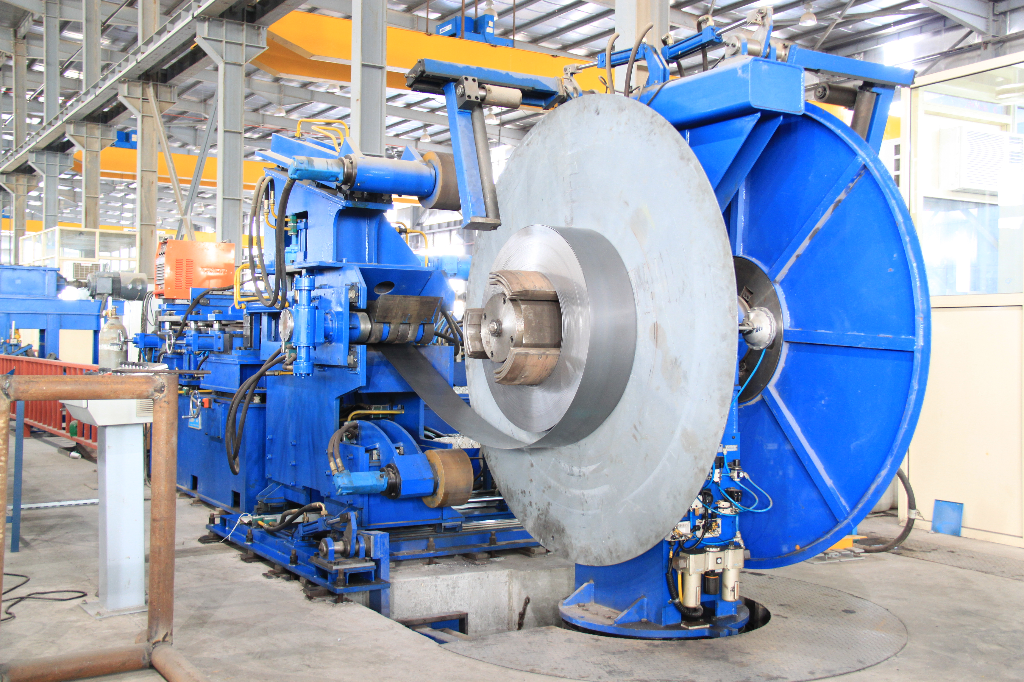 The coil feeder un-bands the strip and automatically feeds it through a coil leveler to a sheer press. After the incoming strip is sheered, it is aligned with the tail of the previous coil and a robotic TIG welder welds the two together.